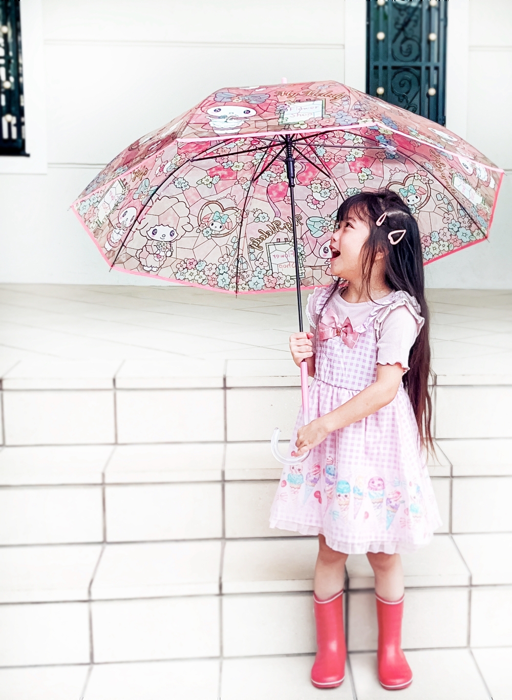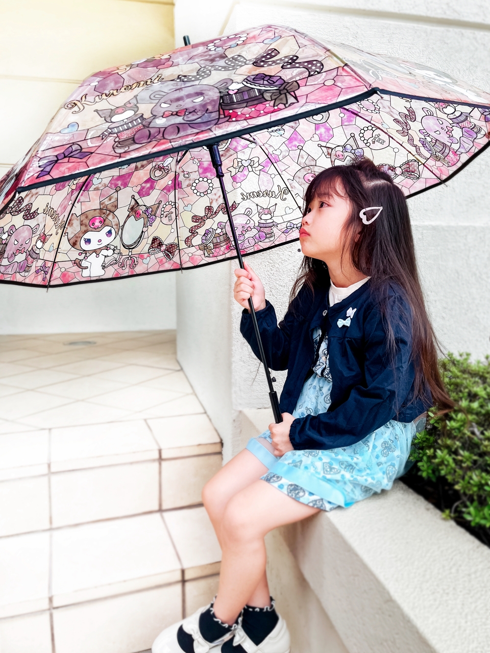 傘に描かれたマイメロディとクロミがまるで本物のステンドグラスのように美しいビニール傘です。