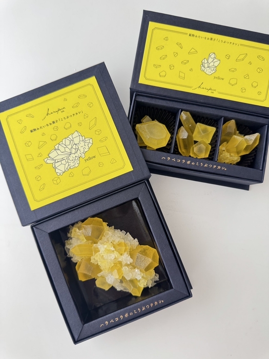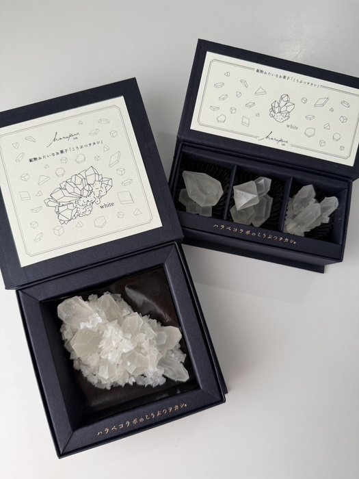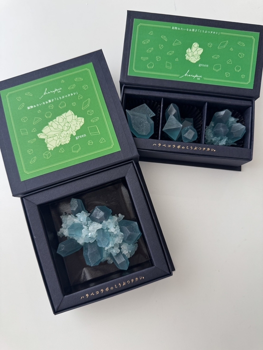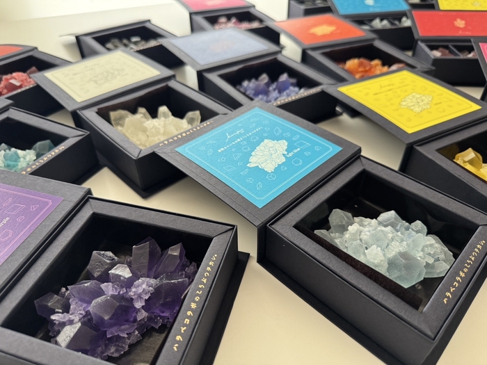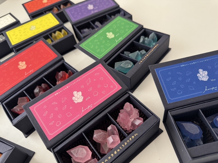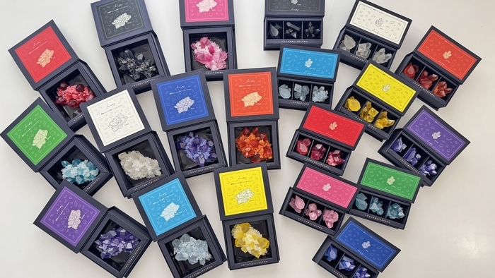 今回登場したのは、“自分の推し”や“大切な人の好きな色”を選んで楽しめる全10色展開のこうぶつヲカシ。宝石や鉱物をモチーフにした琥珀糖は、職人がひとつひとつ小刀で切り出して丁寧に仕上げ、まるで本物の鉱石のような透明感と輝きを放ちます。