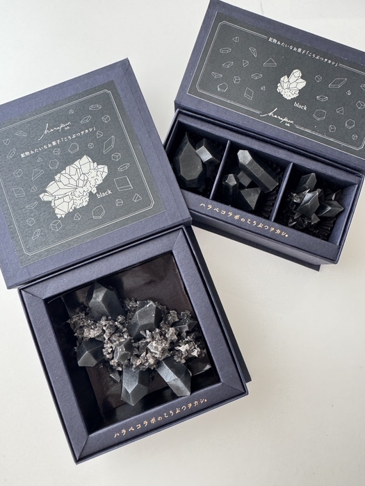 「推し色のこうぶつヲカシ」は、リキュールや果汁、黒ごまペーストなどで風味をつけ、見た目だけでなく味も楽しめるアートスイーツ。天然由来の着色料を使用し、神秘的な鉱物の美しさと味わいを表現しました。