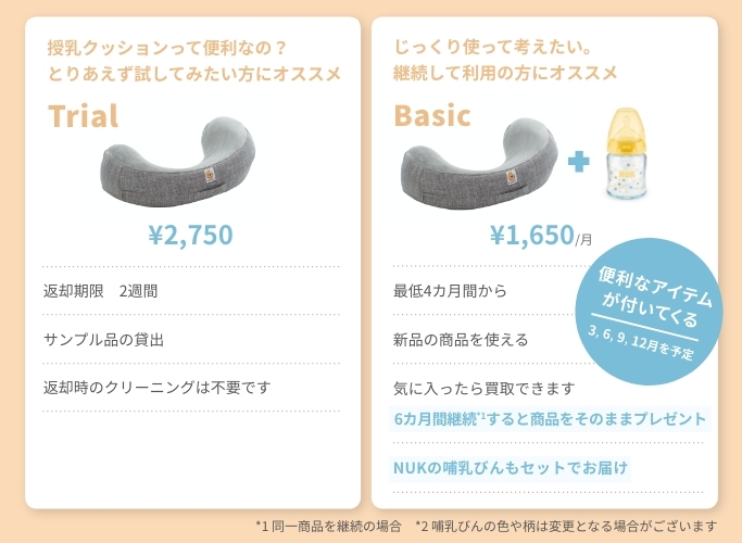 ※3、6、9、12月(予定)に育児に役立つアイテムが届く特典付き。