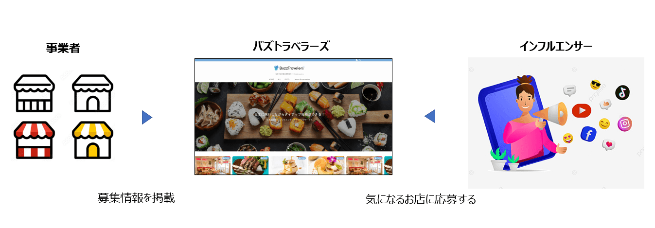 バズトラベラーズは、主に訪日外国人や在日外国人で、英語や中国語で情報を発信しているインフルエンサーと、日本企業をマッチングして、企業のPRを行ってもらうプラットフォームです。言語の問題や金額などで採用が難しかった外国人インフルエンサーを、プラットフォームの利用料のみで起用することが可能になります。