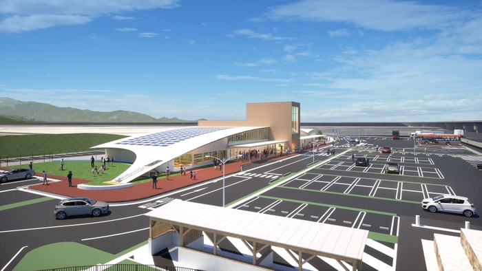 当施設は、国道を挟んで北側の北エリアのキャンプ場も含め約10万m2という広大な敷地の中にあり、オートキャンプ場を併設 した道の駅としては県内唯一。そして、このたびオープンする南エリアには、物販コーナーやレストラン、情報発信施設などのほか、大型遊具を備えた屋内のキッズコーナーや中庭、屋外には芝生広場も設けており、お子様から大人までご家族でお楽しみいただける、エリア内最大級の体験型「食のテーマパーク」になります。