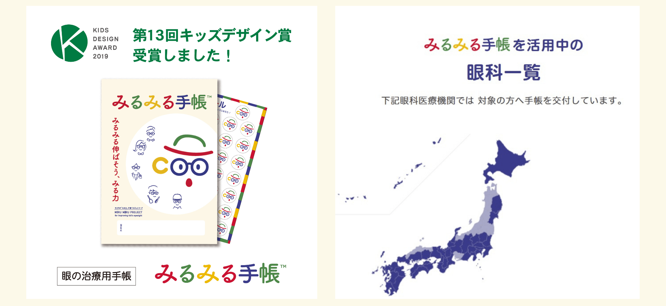 【みるみる手帳】は弱視斜視と診断された子どもと保護者のための眼の管理手帳。全国300以上の眼科医療機関で活用されメガネ専門店も記入しています。2年連続キッズデザイン賞受賞。改訂を重ねながら無償提供を続けています。