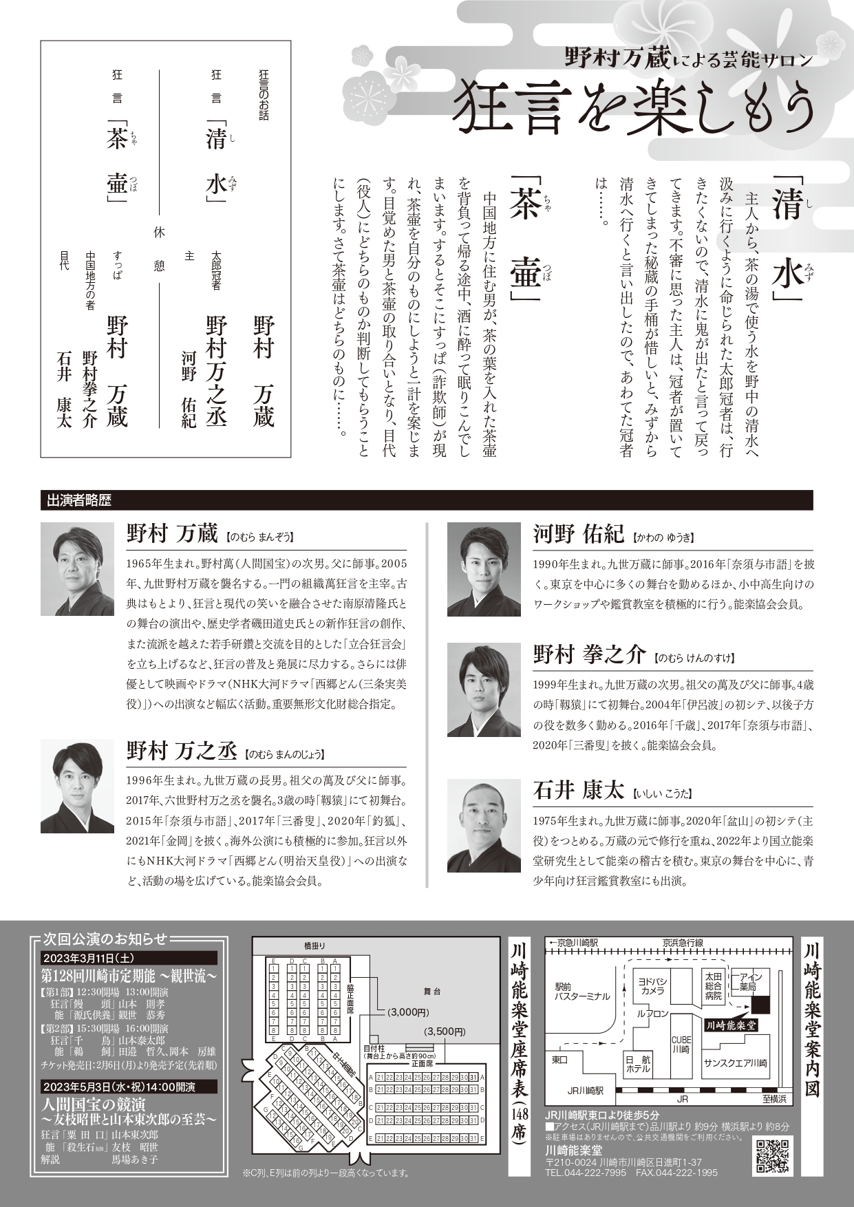 公益財団法人 川崎市文化財団主催、『野村万蔵による芸能サロン~狂言を楽しもう~』が2023年1月22日 (日)に川崎能楽堂(神奈川県川崎市川崎区日進町1-37)にて上演されます。