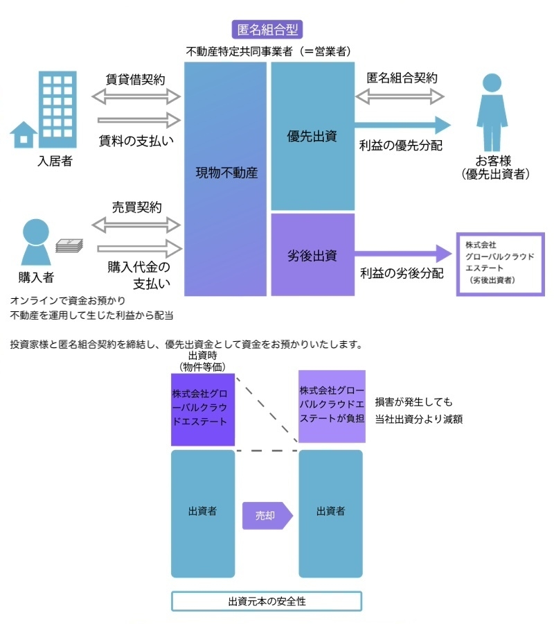 優先出資者の元本の安全性を高めるため、当社がプロジェクトの全体20%出資することで価格下落が生じた場合も20%までの下落であれば、投資家様の元本は守られる仕組みを採用いたします。