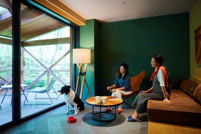 客室は土足禁止なので室内犬も安心!中庭を備えた開放的なパブリックスペース「TAMARIBA(タマリバ)」でも愛犬と一緒に過ごすことができます。また、徒歩圏にある「ハルニレテラス」で、ウッドチップが敷かれた遊歩道でお散歩したり、レストランのテラス席で食事をしたり、軽井沢の自然を感じながら愛犬との休日を楽しめます。冬は、森に囲まれた屋外スケート場「ケラ池スケートリンク」の周りを一緒に歩けば、まるで氷上散歩したような気分を味わうことができます。