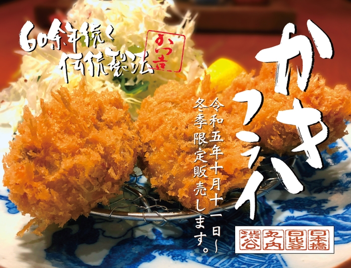 いつもかつ吉をご愛顧いただきありがとうございます。今年も冬の味覚「かきフライ」を2023年10月11日(水)より販売いたします。どうぞよろしくお願いします。かつ吉渋谷・新丸ビル・日比谷国際ビル・日本橋高島屋S.C.店