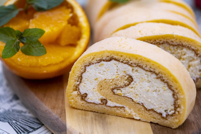 純生クリームにフレッシュオレンジとヨーグルトを混ぜ、クリームたっぷりなのに、爽やかで軽い口当たりのロールケーキに仕上げました。