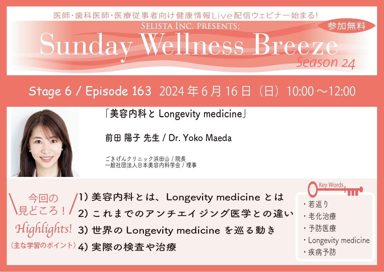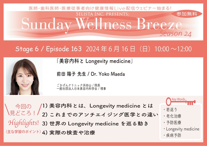 《医師・歯科医師・薬剤師向け》 無料オンラインセミナー6/16(日)朝10時開催 『美容内科とLongevity medicine』 講師:前田 陽子 先生(ごきげんクリニック浜田山/院長)