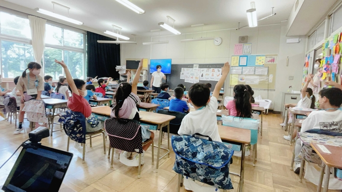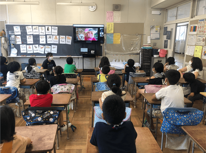 東京都羽村市の小学校では、6月より1〜4年生の英語教育の活動に『Mimmyアドベンチャー』を導入しました。初日となる6月3日(木)は、1年生の2つのクラスで、今年度3回目となる外国語の活動が実施され、『Mimmyアドベンチャー』を利用し、「動物で遊ぼう」をテーマにアメリカ現地とオンラインで交流を行いました。
