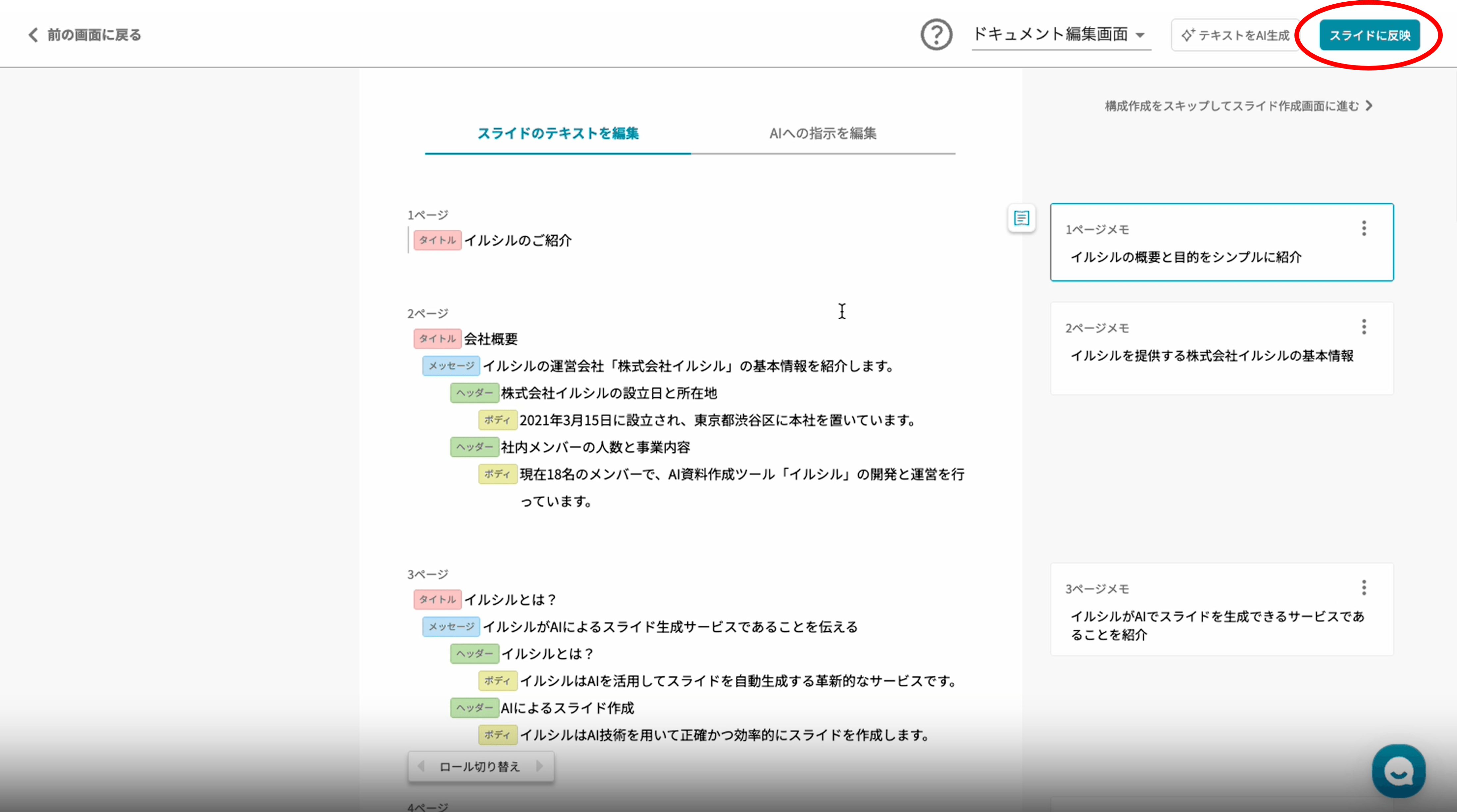 ここではテキストの編集ができるので、細かく内容を修正可能です。問題がなければ右上のスライドに反映をクリックします。