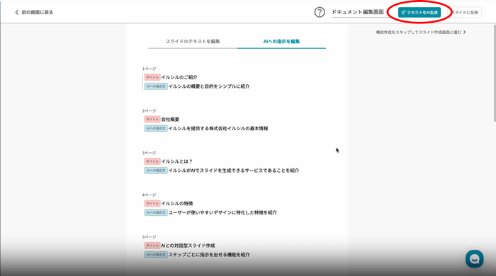3.添付された資料をもとに、AIがスライドのページ概要を示します。ここでは各スライドのAIへの指示を編集することが出来るので、意図するものと異なる場合には修正ができます。修正後、問題がなければ右上にあるテキストをAI生成をクリックします。