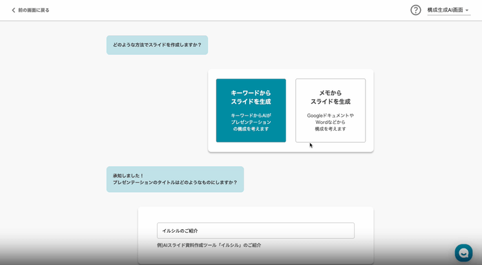 1.スライド生成方法選択画面において「キーワードからスライドを生成」「メモからスライドを生成」どちらかを選択します。