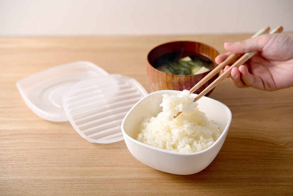 冷凍ご飯をふっくら&もっちりと温め直しができ、しかもそのまま食卓でお茶わんとしても使える、機能性とカタチにこだわった保存容器です。