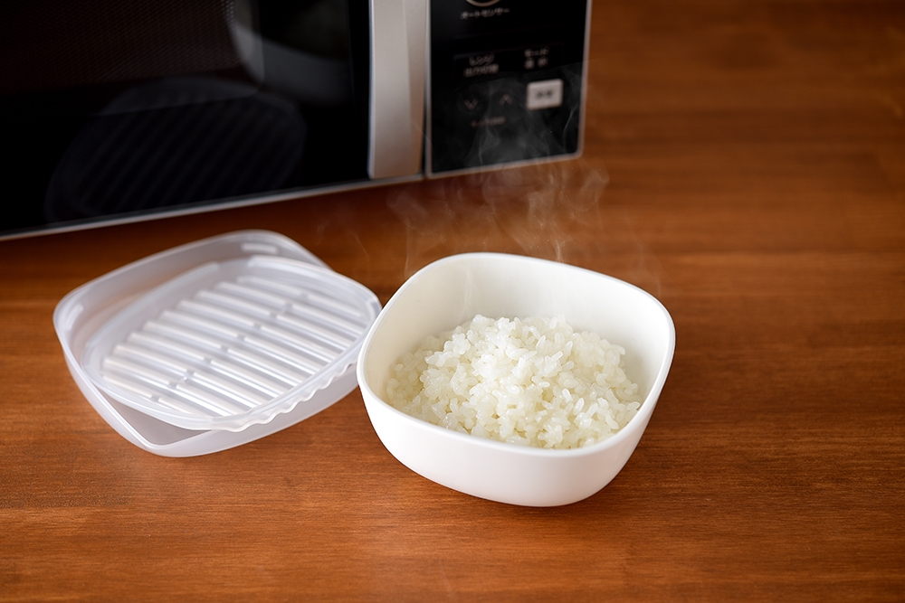 【ご飯がう米(まい)わん】は、電子レンジで温める時の置き方に目を付けました! ひっくり返して逆さにして温めることで、スノコが余分な水滴を落とし、蒸気でふっくら&もっちりな仕上がりに。