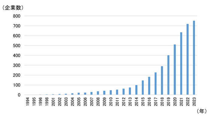 また、企業数の推移に注目したところ、1994年に中国への進出が始まって以来、一貫して増加傾向にあり、特に2015年以降に急増しています。これは、当時の中国経済の成長や所得水準の向上による購買力の増加が影響したとみられ、多くの日系飲食業者が成長の期待される中国市場へ積極的に進出する要因の一つになったものと考えられます。(図2)