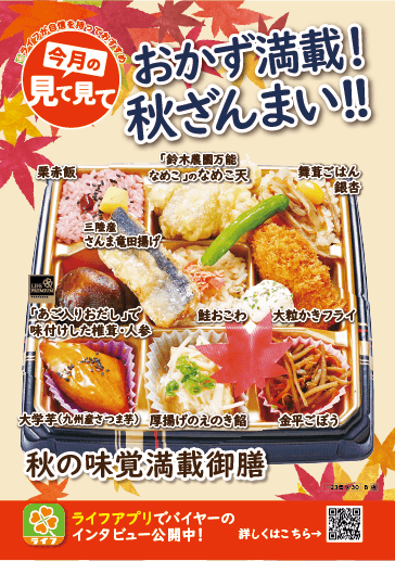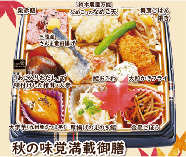 “おいしい” “ワクワク” “ハッピー” をお届けするライフコーポレーションは、秋の味覚が盛りだくさんの「秋の味覚満載御膳」を、首都圏ライフにて9・10月の期間限定で販売中です。