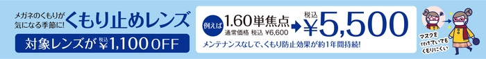 くもり止め機能付き対象レンズが税込1,100円OFF!マスクの装用や寒暖差でメガネのくもりが気になるこの季節、くもり止めレンズで快適な毎日を!