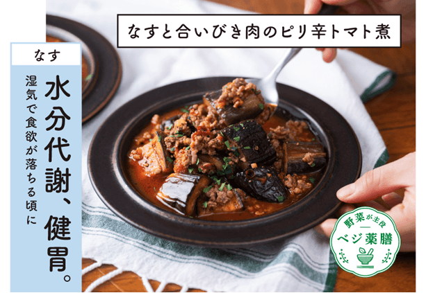 6月26日に新着公開した「なすと合いびき肉のピリ辛トマト煮」は、料理家 齋藤 菜々子先生考案の「野菜が主役 ベジ薬膳」シリーズです。湿気の多い梅雨は、体が余分な水分をため込み、むくみやだるさが起こりやすくなります。そんな不調を吹き飛ばしてくれる「なす」が主役のとっておきレシピをお届けします。