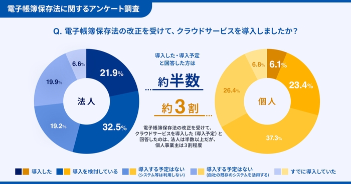 ・電子帳簿保存法を機に法人の半数以上でクラウドサービスが導入、または導入の検討が行われている