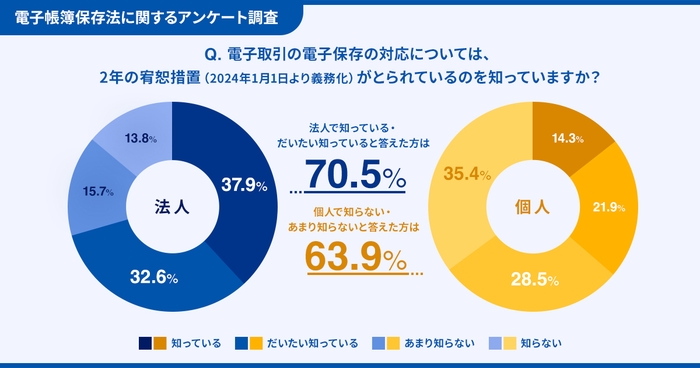 2023年中まで設けられている「宥恕措置」について、法人では「知っている」が37.9%、「だいたい知っている」が32.6%と、7割以上に認知されているのに対し、個人事業主では「あまり知らない」が28.5%、「知らない」が35.4%と、6割以上に知られていないことがわかりました。