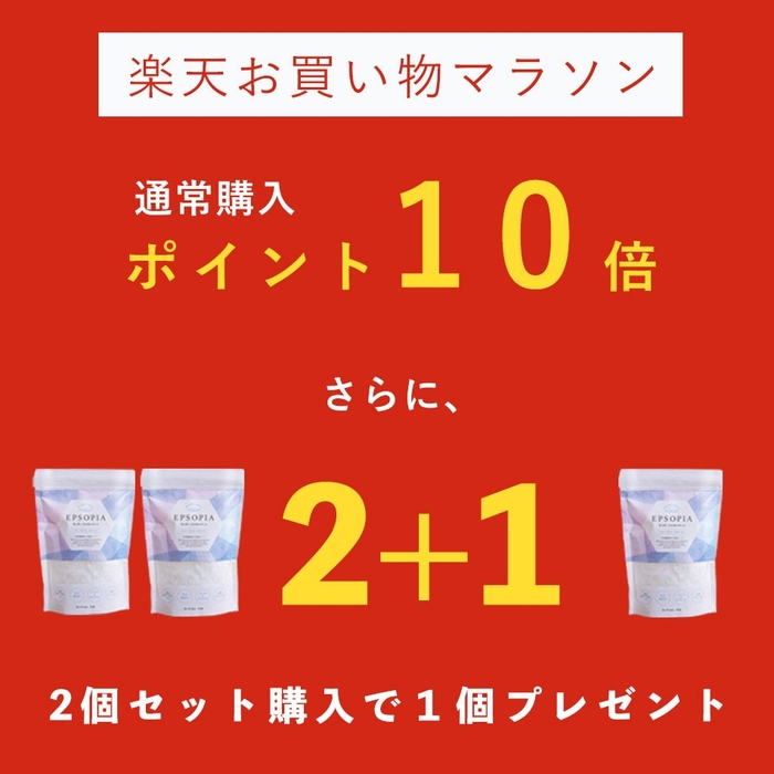 エプソピア楽天市場店は完全無添加のバスソルト『エプソピア』をおトクに購入いただくために、2025年8月24日(日)20:00~2025年8月27日(水)09:59 の楽天お買い物マラソン期間に合わせて、2個セットに1個プレゼントの企画を開催。さらに期間中は通常購入がポイント10倍。