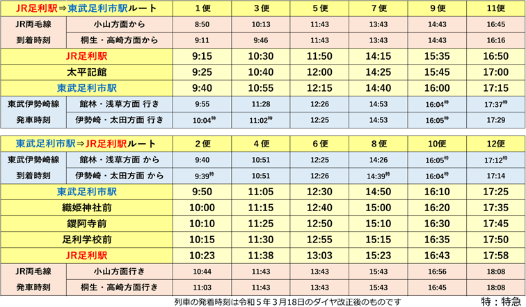 (JR足利駅→東武足利市駅 約1.8km/東武足利市駅→JR足利駅 約2.9km)
