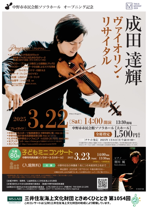 中野市市民会館 ソソラホールオープニング記念「成田達輝ヴァイオリン・リサイタル」開催、チケット発売開始 ピアニストは實川風