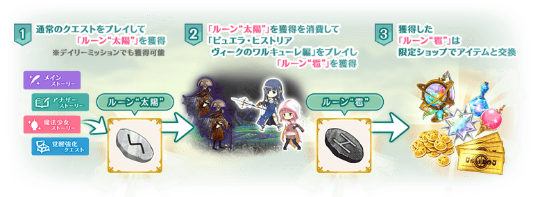 本イベントで獲得した「ルーン“雹”」は限定メモリア「天馬駆ける」「姉妹の夜は更けて」や、限定ホーム背景「ヴィークのワルキューレ編」、下記のホーム画面用の魔法少女の衣装等、貴重なアイテムと交換できます。
