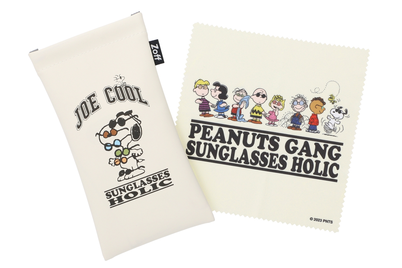 たくさんのサングラスをかけたJOE COOLがキュートなオリジナルケースとPEANUTSの仲間たちが勢ぞろいのメガネ拭きがついてきます。※柄や色味の出方に個体差があり、画像と異なる場合がございます。