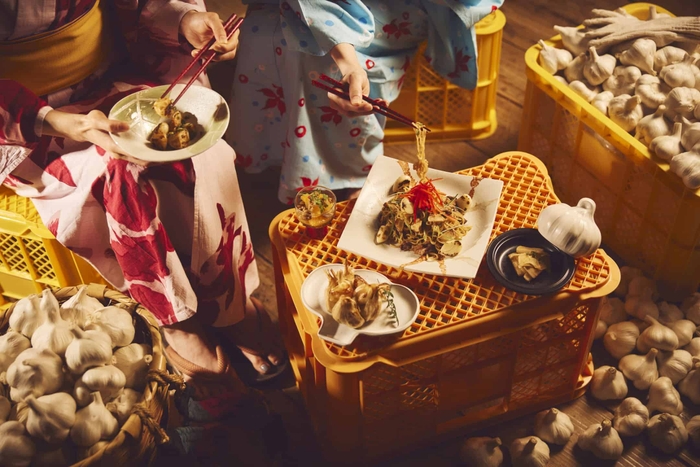 青森の文化を目一杯満喫できる宿「星野リゾート 青森屋」では、2022年6月1日から8月31日までの期間、畑からメニューを収穫し、にんにく料理を味わうアクティビティ「にんにくハウス931」を実施します。にんにくが収穫期を迎える夏に、畑からにんにくを収穫するようにメニューを引っこ抜き、個性的なにんにく料理を味わえるアクティビティです。2年目を迎える今回は、見た目も、味も、食感も異なるにんにくを、一度に楽しめる料理「たんげ(*1)にんにく臭くてご麺」が新登場します。