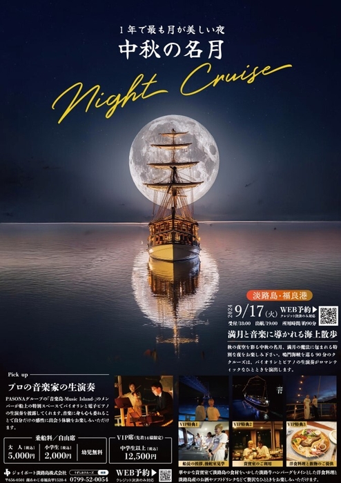 兵庫県・淡路島から出航している「うずしおクルーズ」を運営するジョイポート淡路島株式会社(本社:兵庫県南あわじ市福良、代表取締役:鎌田 勝義)は、2024年9月17日(火)限定で特別便「中秋の名月ナイトクルーズ」を開催いたします。通常は昼間にしか運航していない「咸臨丸」で幻想的な夜の鳴門海峡に出航し、特別な満月とプロの音楽家による生演奏をお楽しみいただけます。