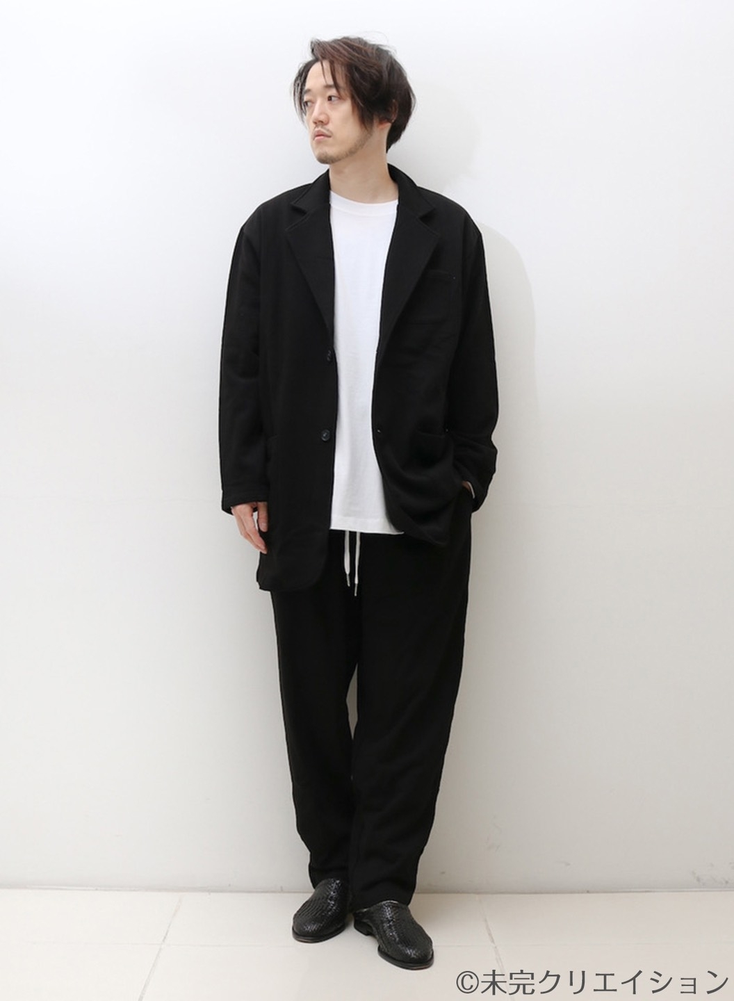 フロントに垂らした白紐は、上下ブラックのセットアップにアクセントを添えてくれます。