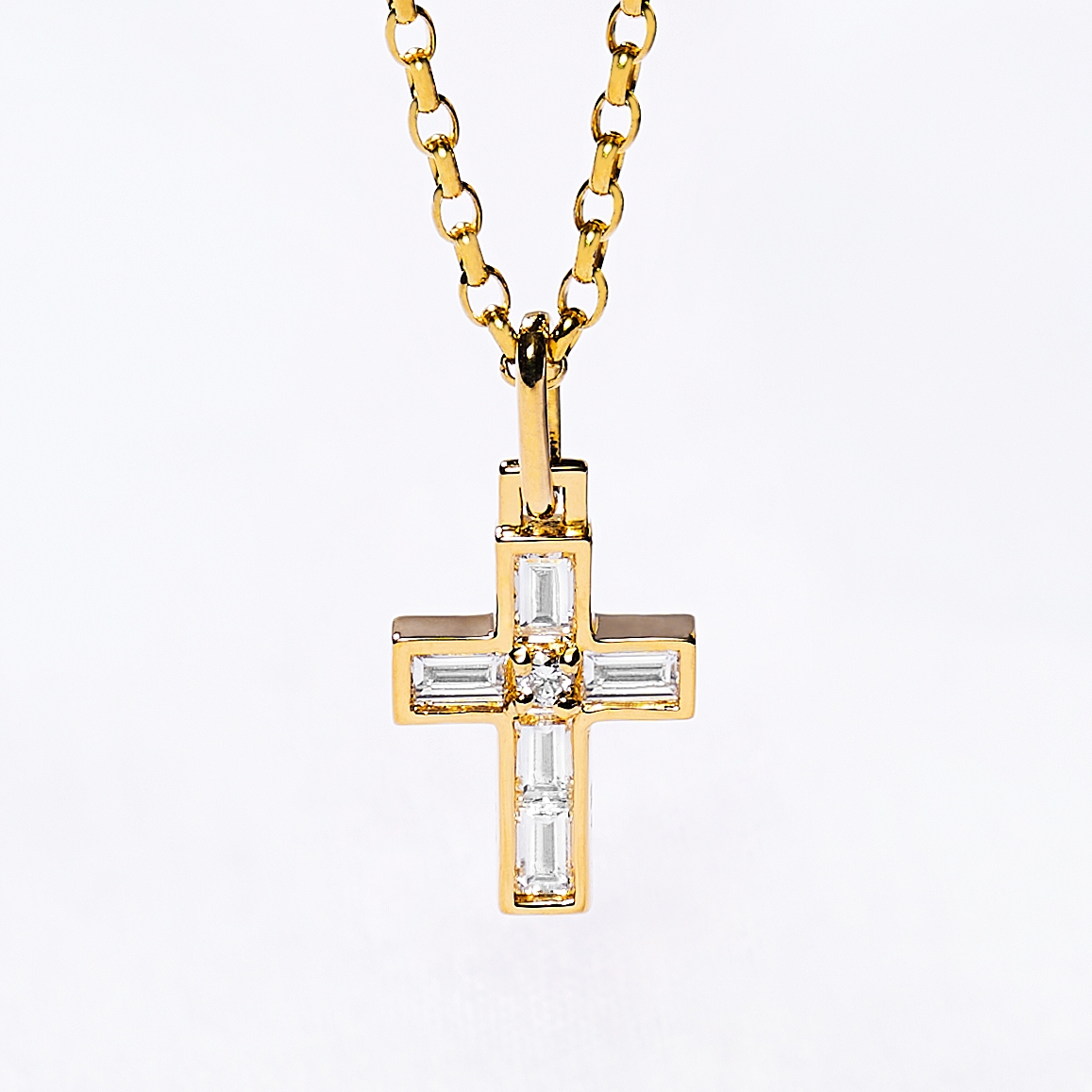 大人の好奇心を刺激する【CURIOSITY CROSS COLLECTION】より厳選したダイヤモンドを使用したミニマルなデザインのクロスネックレスが登場。日常使いしやすい上質なブリリアントカットのダイヤモンドと透明感あふれるバゲットカットのダイヤモンドをセッティング。コントラストが効いた煌めきが魅力の逸品です。