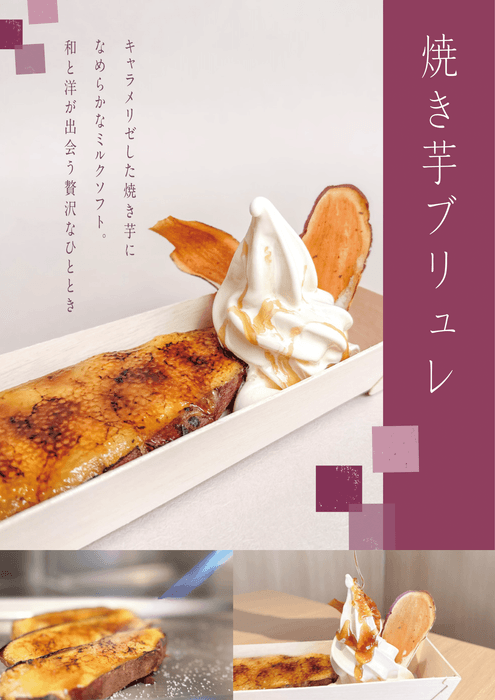 キャラメリゼされた和の焼き芋と特製のお芋蜜、洋風のお芋プリン、そして冷たいミルクソフト が見事に調和し、他にない贅沢な味わいを生み出しています。