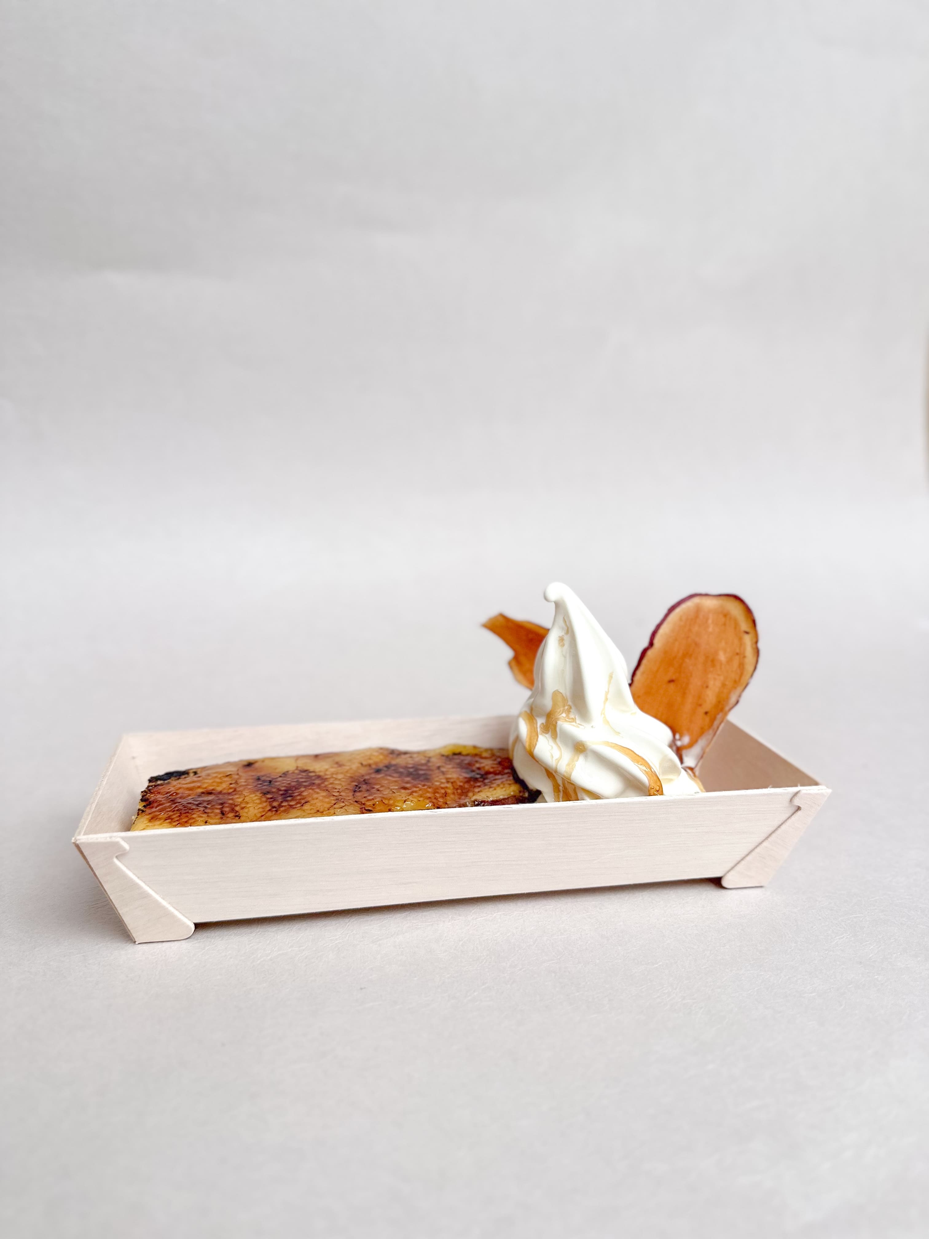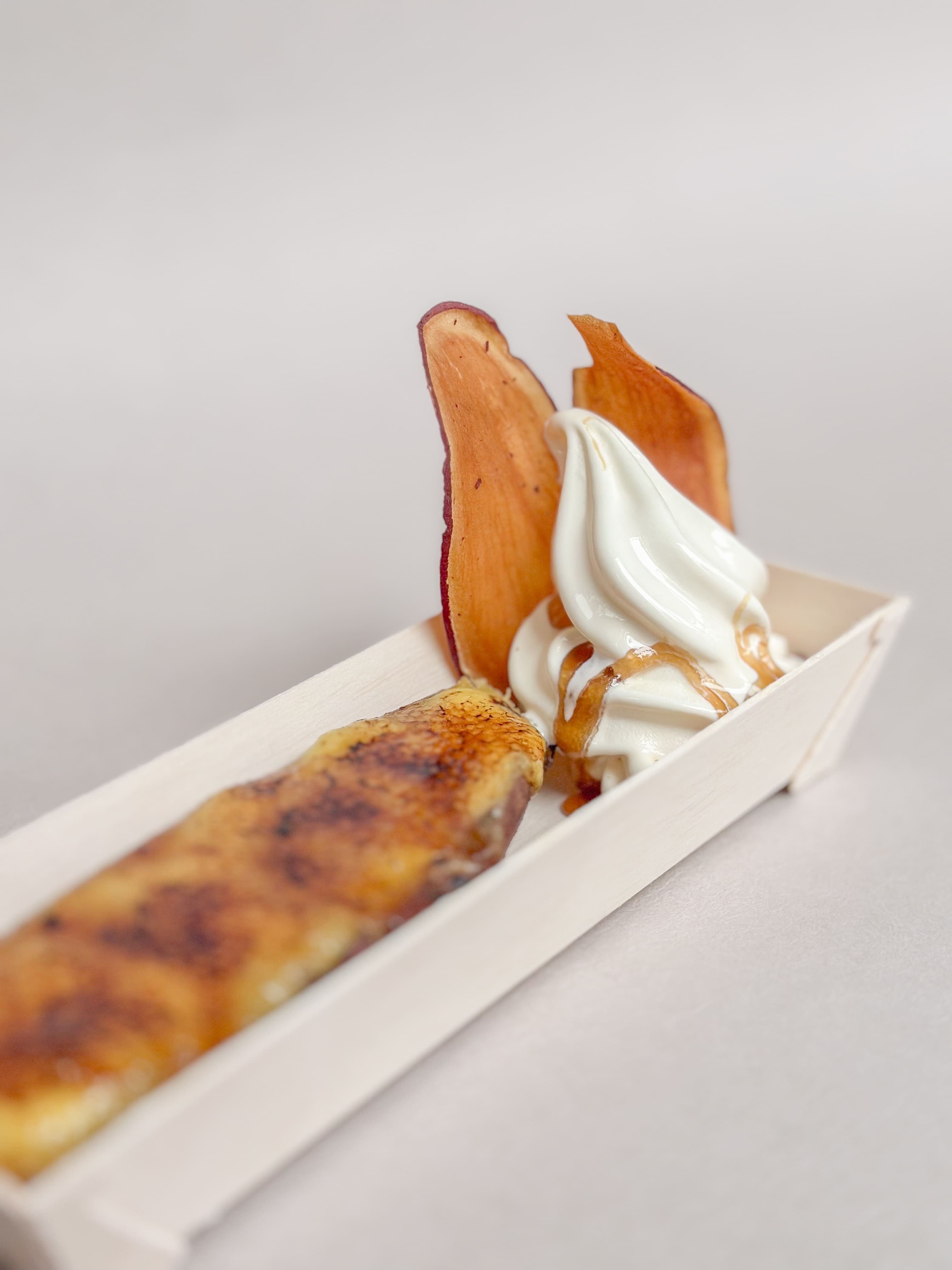 しっとり、ねっとりとした舌触りで、甘い蜜がたっぷりと凝縮された自慢の焼き芋の表面を香ばしくキャラメリゼして使用しています。