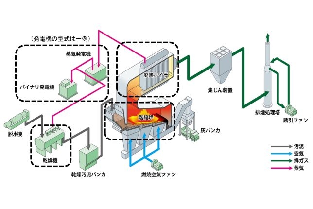 本システムは、階段炉、廃熱ボイラ、蒸気発電機、汚泥乾燥機で構成されます。含水率が80%程度ある下水汚泥の焼却処理において、燃焼熱を廃熱ボイラで回収して汚泥乾燥と蒸気発電に利用することにより、補助燃料である化石燃料を使用せずに焼却を行うとともに、電力を創出できるシステムです。