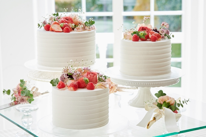 厳選食材を使用したプレミアムなフルーツケーキや、ご両親やご兄弟などと一緒にケーキ入刀が叶う3つセットのショートケーキなど、25名までの少人数だからこそ叶うこだわりを詰め込んだケーキ。