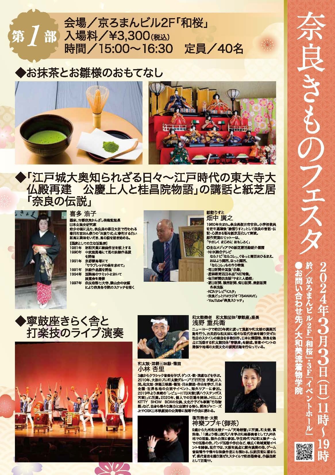 また同日企画として三条通りにある当社京ろまんビルにて「奈良きものフェスタ」を開催いたします。フェスタ1部は2F「和桜」でお抹茶とお雛様のおもてなし、東大寺大仏殿再建の講話や紙芝居、和太鼓や篠笛によるパフォーマンスを開催。フェスタ2部では和ドレスのファッションショーやデザイナートークショーを開催します。また3Fイベントホールでは、奈良きものマルシェとして、つまみ細工など10ブース以上の楽しいマルシェを出店し、さらには絵画と和ドレスの展示販売会やPOPS音楽ユニットのミニライブショーも開催し、和文化振興に取り組みます。