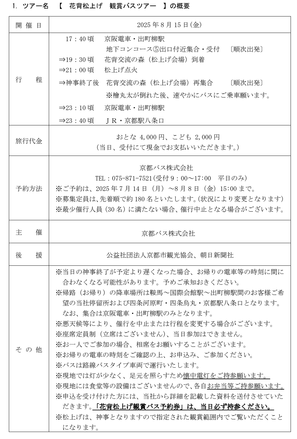 京都バス株式会社(本社:京都市右京区 代表取締役社長:吉本直樹)は、2025年8月15日(金)に左京区花脊八桝町にて催される「花背松上げ」、2025年8月24日(日)に左京区広河原下の町にて催される「広河原松上げ」行事に合わせ、「観賞バスツアー」をそれぞれ企画・販売します。例年、当ツアーは帰着地を京阪電車出町柳駅としていましたが、本年は四条河原町・四条烏丸・京都駅八条口まで範囲を広げ、京都市内中心部にご宿泊のお客様にもご利用いただきやすいツアーとしました。