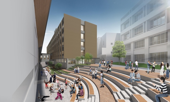 この「名城大学開学100周年記念アリーナ」は、天白キャンパスの正門アプローチを登った先の旧2・3号館の跡地に建設中で、2026年に開学100周年を迎える本学の新たなシンボルとなる多目的総合アリーナ。メインアリーナはバスケットボールコート4面分が取れる広さを誇り、その大空間を覆う大屋根の工事が進められています。