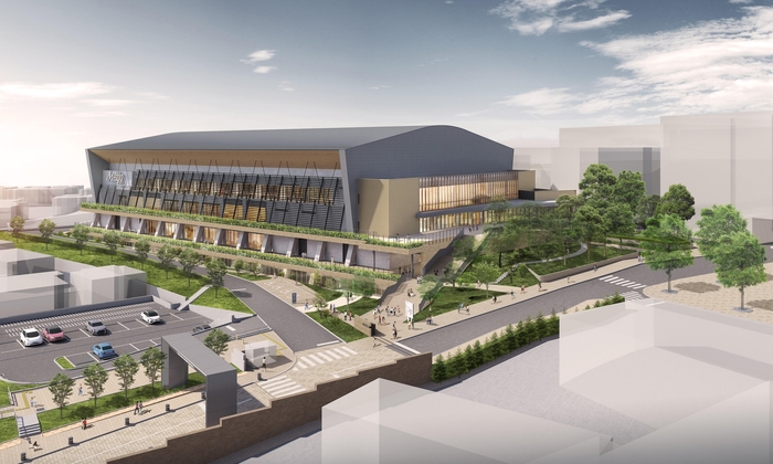 隣接するクラブハウス棟は建設工事が先行して進められており、躯体工事は完了。現在は、外装工事を行っています。両施設とも2025年度中の完成に向け、着々と工事が進んでおり、巨大な構造物が段々と姿を現していきます。