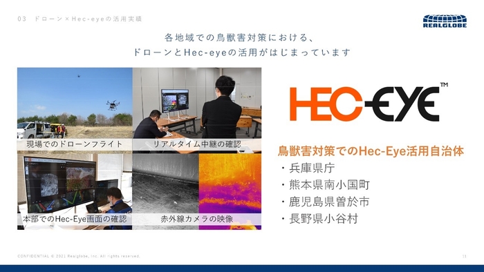 「Hec-Eye」は株式会社リアルグローブが、一般社団法人EDAC監修のもと開発した、ドローン等からの取得情報を地図上に集約し共有するプラットフォームで、総務省の「平成27年度補正予算IoTサービス創出支援事業」の採択案件を通じて構築されたリファレンスモデル(成果物)を核として開発されたサービスです。救急医療・災害対応分野での活動支援や業務効率化を目的として開発され、現在は鳥獣害対策や観光分野等も含めたより広い分野で活用されています。