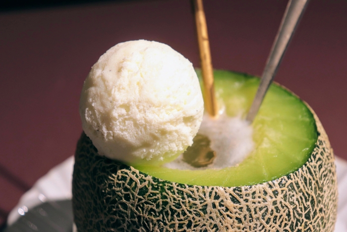 その名の通り、メロンをまるごとひとつ使用したスイーツです。メロンの種の部分をくり抜き、凍らせたメロンにソーダを注ぎ、バニラアイスを添えて提供します。メロン用のスプーンとストローがついてくるので、シャーベット状の果肉を削ってフレッシュな果肉感を味わったり、バニラアイスを溶かしてクリーミーにしたり、自分好みの楽しみ方ができます。メロンは下にいくほど甘みが強いので、最後まで「おいしい」を満喫できます。見た目も華やかでインパクト大なので、サイクリングの目標達成や記念日をお祝いする乾杯シーンにもぴったりです。