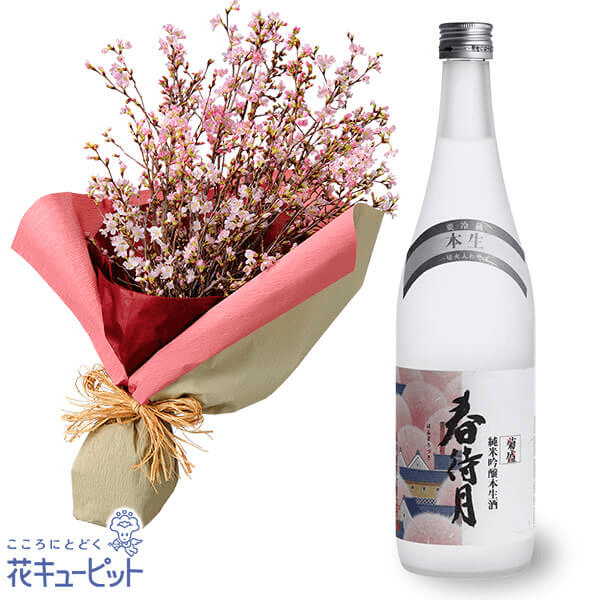 ご自宅でゆっくりとお花見を楽しめる、桜の枝と「春待月」のセットです。「春待月」は華やかな香りの中に、ほんのりと米の甘味を感じる春限定の純米吟醸本生酒です。瓶の中で活きた酵母が、爽やかな微発泡性を醸し出します。寒仕込みのもろみはゆっくりと醗酵し、ちょうど酒蔵に花が咲く頃、薫り高い新酒として出来上がります。春の息吹を楽しみながら、ぜひ涼冷えでお召し上がりください。
