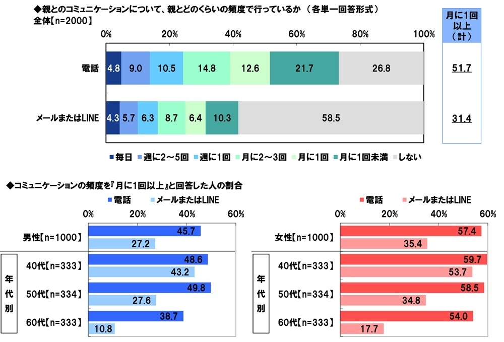 「電話を月に1回以上する」は約半数、「メールまたはLINEを月に1回以上する」は約3割