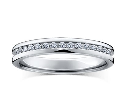 レール留めという手法でダイヤモンドの周りが覆われていて凹凸が無く、美しさが引き立ち、ふだんの生活でも使いやすいデザイン。