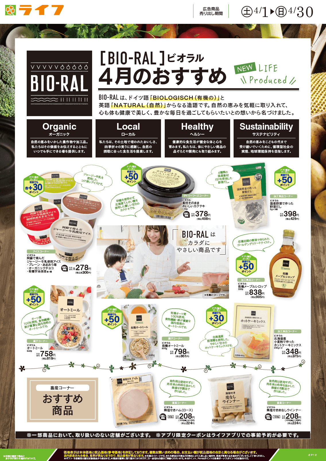 ※「BIO-RAL4月のおすすめ」チラシ掲載商品は近畿圏一部店舗でも通常売価で販売しております。