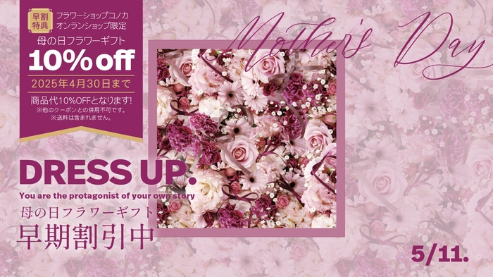 コノカのオンラインショップでは、母の日限定ギフト予約販売スタートにあわせて4月1日~4月30日の期間中にご注文頂いた方対象に商品代金10%割引で購入できる【早期割引特典】を実施します。