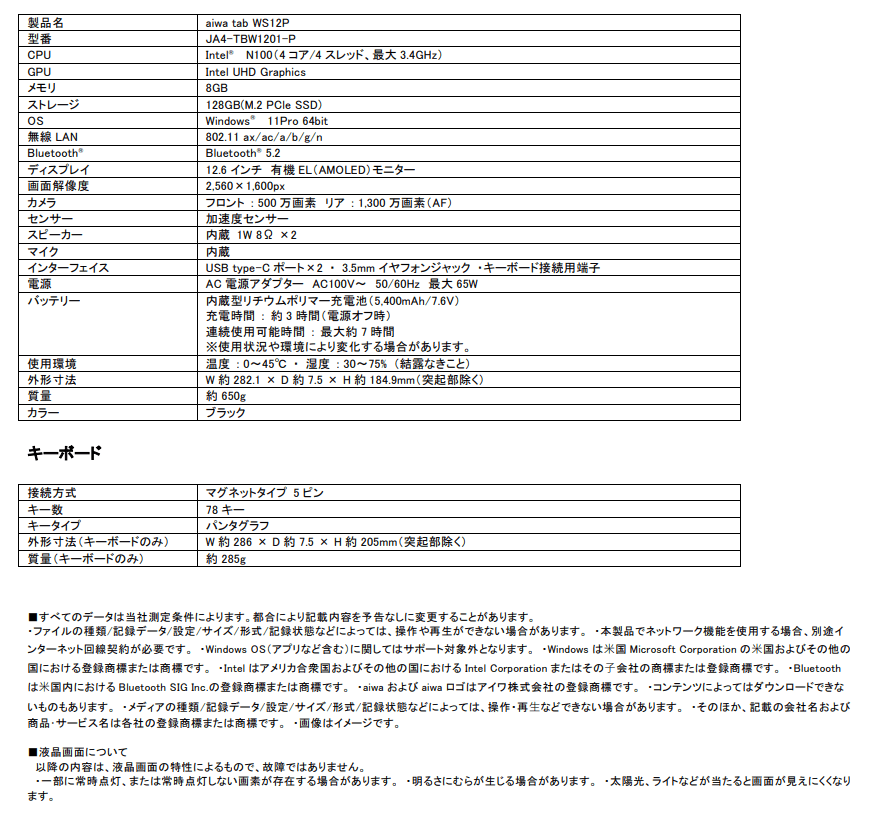 テクミラホールディングスの子会社であるアイワマーケティングジャパン株式会社(本社:東京都千代田区、代表取締役社長:藤岡 淳一、以下 アイワマーケティングジャパン)は、新製品として高明細な有機ELディスプレイとモバイルに最適な低消費電力型CPU、その他多機能スペックに加えカバー兼スタンドとキーボードを標準搭載のタブレット【aiwa tab WS12P】(以下 本製品)を、「ダイワボウ情報システム」、「TD SYNNEX」にて法人向けモデルとして販売開始いたしました。